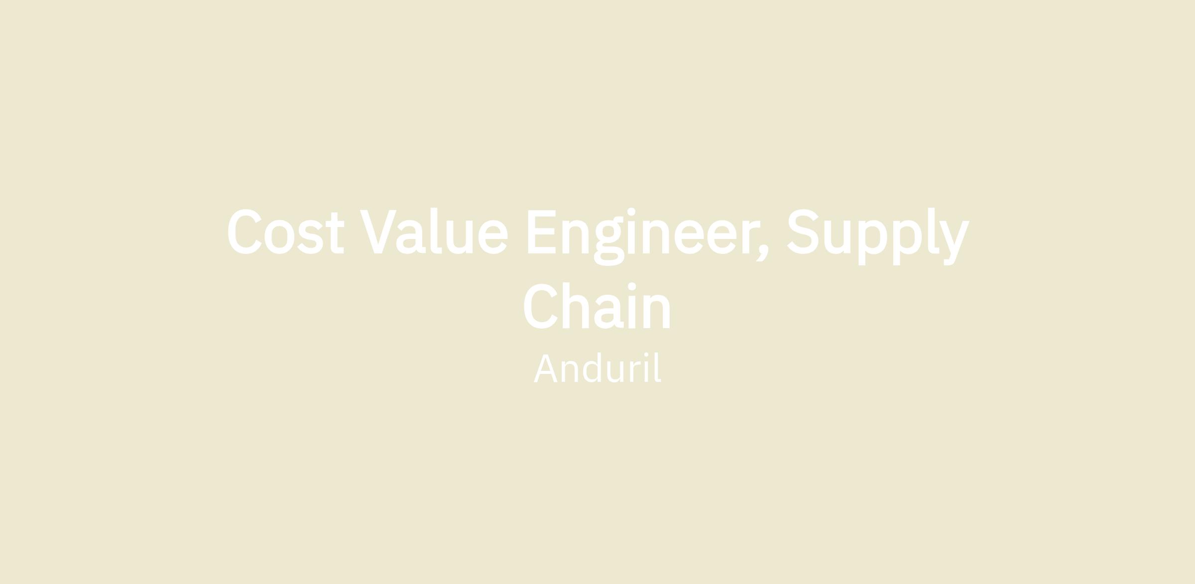 The Cost Value Engineer (internally known at Anduril as Product Sourcing Engineer) drives the strategic supply network development and cost management of Anduril’s product hardware across their lifecycles, by collaborating with suppliers and cross-functionally, including folks in engineering, quality, and manufacturing.