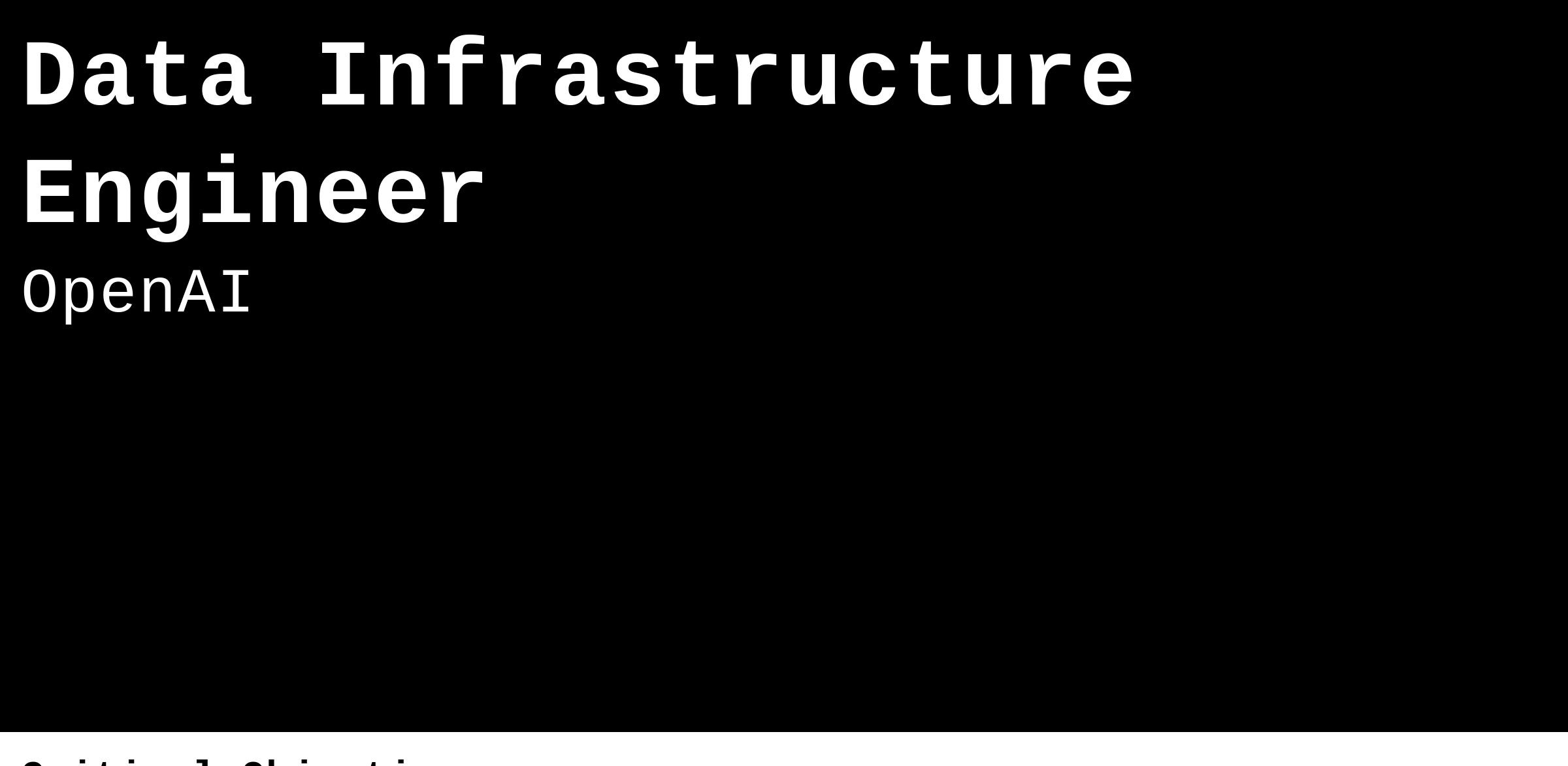 You’ll join the team that’s behind OpenAI’s data infrastructure that powers critical engineering, product, alignment teams that are core to the work we do at OpenAI. The systems we support include our data warehouse, batch compute infrastructure, streaming infrastructure, data orchestration system, data lake, vector databases, critical integrations, and more.