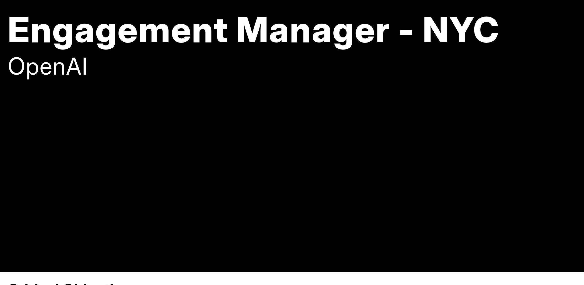 The Engagement Management team ensures the successful post-sales deployment and value realization of ChatGPT Enterprise and other OpenAI products for customers across industries. Engagement Managers collaborate closely with Sales, Technical Success, and Product teams to deliver exceptional AI experiences and measurable business results. Our customers include large enterprises, startups, digitally native organizations, and government entities. As an Engagement Manager, you’ll help companies transform their business by adopting solutions that make use of our newest, most exciting models.