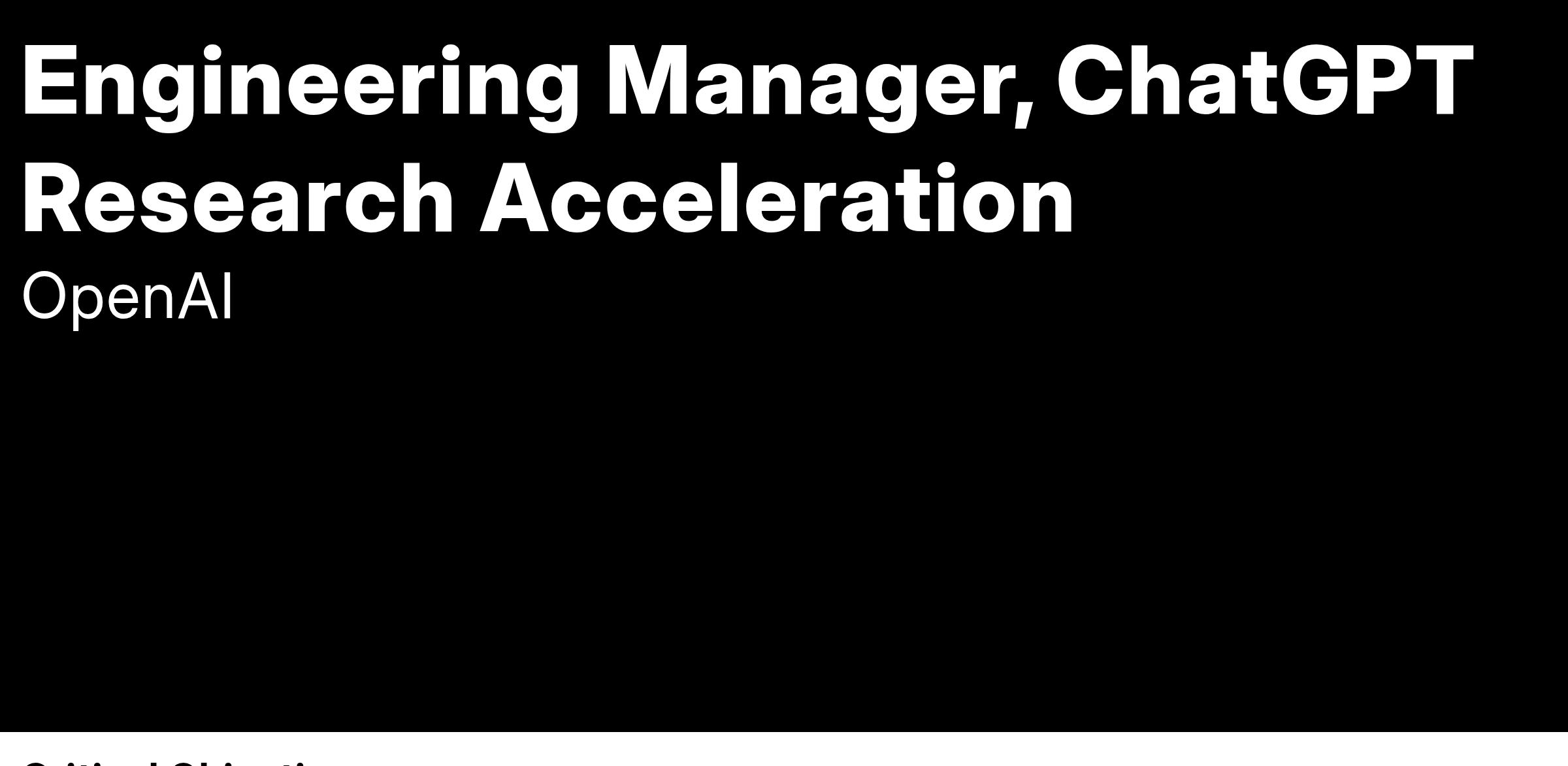 We are looking for an experienced EM to lead 1-2 of the teams within the ChatGPT Research Acceleration team. Our focus is to accelerate research and product innovation with fast, efficient flywheels that empower teams to align models with evolving user needs and human priorities. Our charter is to deliver tools, systems, and infrastructure that accelerate reinforcement learning through rapid experimentation, safe data handling, and constant user feedback.
