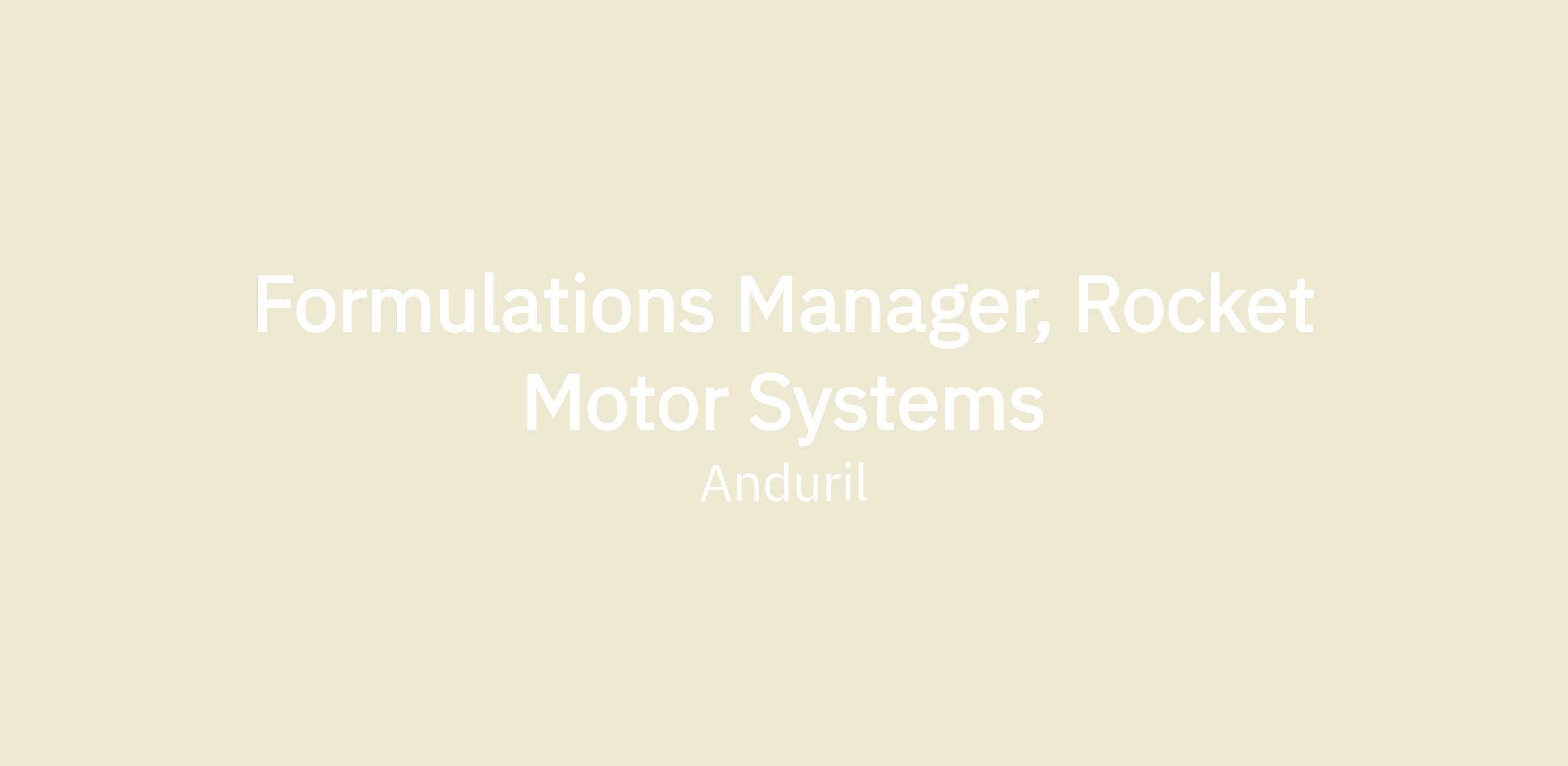 Anduril – Rocket Motor Systems is seeking a Formulations Manager to join our organization. The Rocket Motor Systems group designs, develops, and manufactures next-generation solid rocket motors for defense and space applications at Anduril. The ideal candidate has both experience with energetic materials and solid composite propellant manufacture and formulation and previous technical functional management experience. This role requires in-depth knowledge of propellant chemistry/processing, robust experience in rocket motor testing, and the ability to lead and mentor a team of formulators.