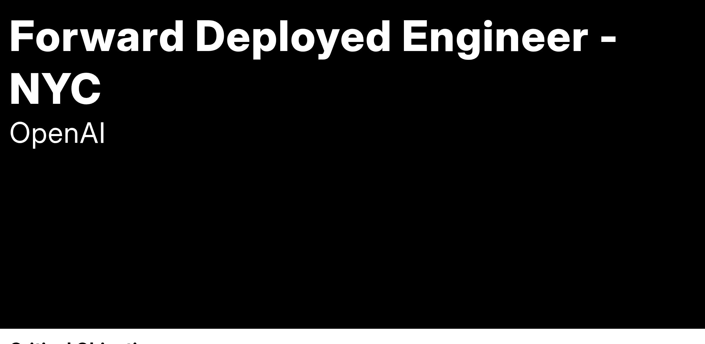 Over the past year, we have experienced a significant increase in demand for OpenAI's hands-on technical expertise to translate abstract ideas into production applications. We’ve established a Forward Deployed Engineering (FDE) team who will work closely with our most strategic customers to deeply understand their use cases and design, build, and implement products for them. As one of our founding FDEs, you will deploy these solutions on customer infrastructure for the world's most influential businesses, driving real business impact through our newest models and our own innovations in technical delivery.