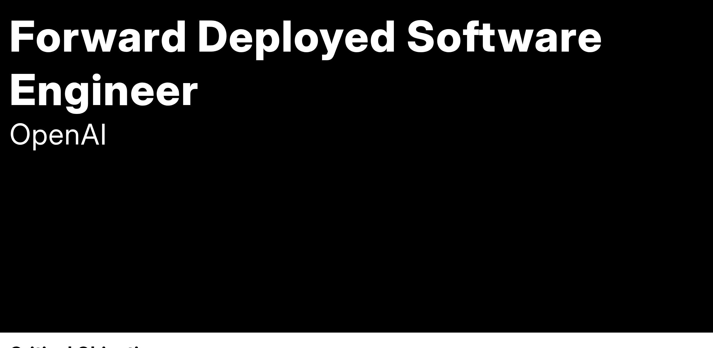 We are looking for customer-focused software engineers to build effective custom software that leverages OpenAI’s APIs to solve real customer problems. As an FDSWE, you will work with our customers and OpenAI Forward Deployed Engineers to design and implement scalable solutions that solve their most difficult problems. You will design abstractions to solve customer problems, and then use them to scale our speed and quality of delivery across all Forward Deployed engagements.
