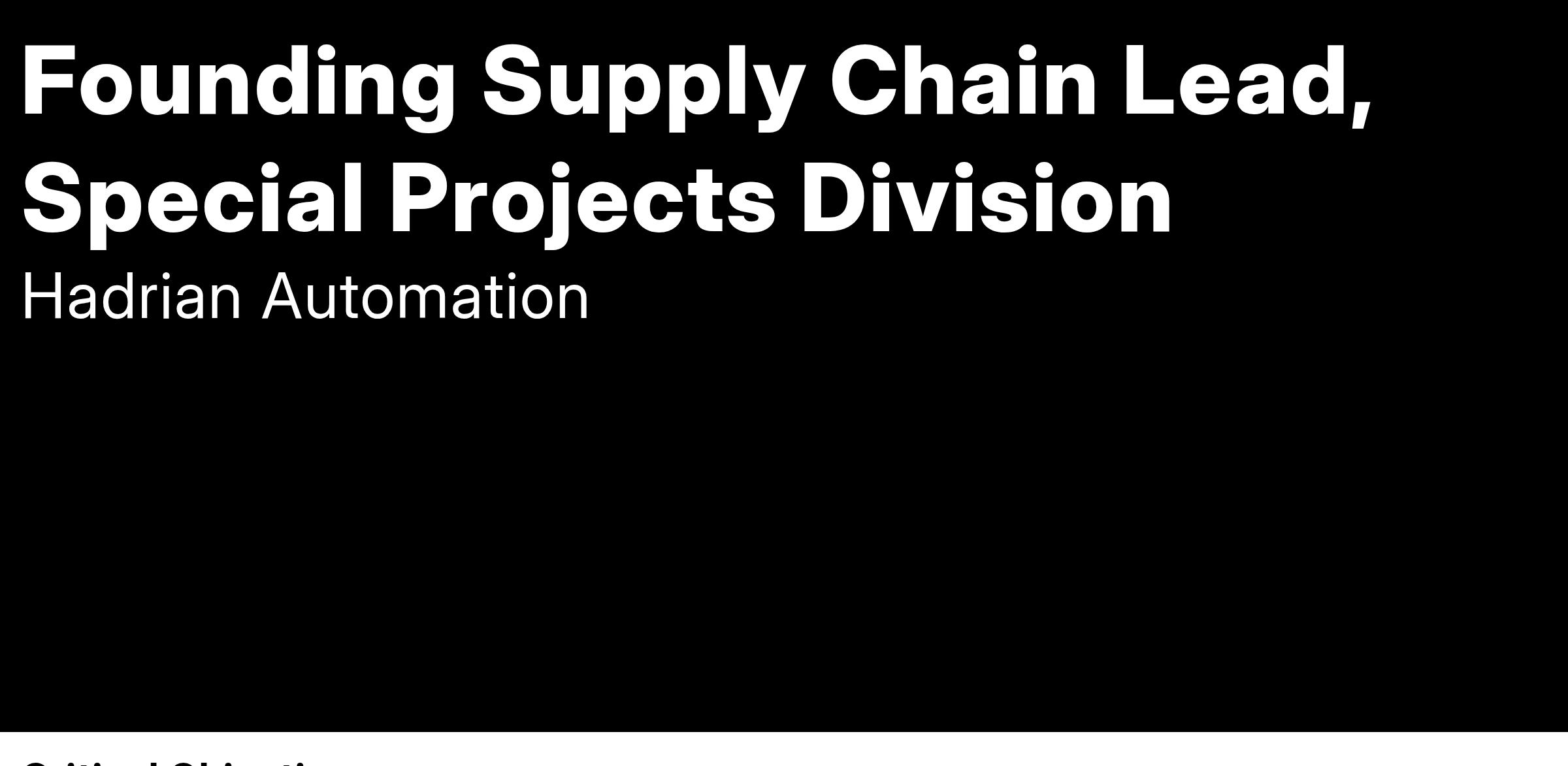 You will be a founding member of Hadrian’s new Special Projects division, collaborating directly with the CEO and engineering leadership. This division is responsible for focusing on ambitious R&D projects and serving as engineering experts on new business opportunities.