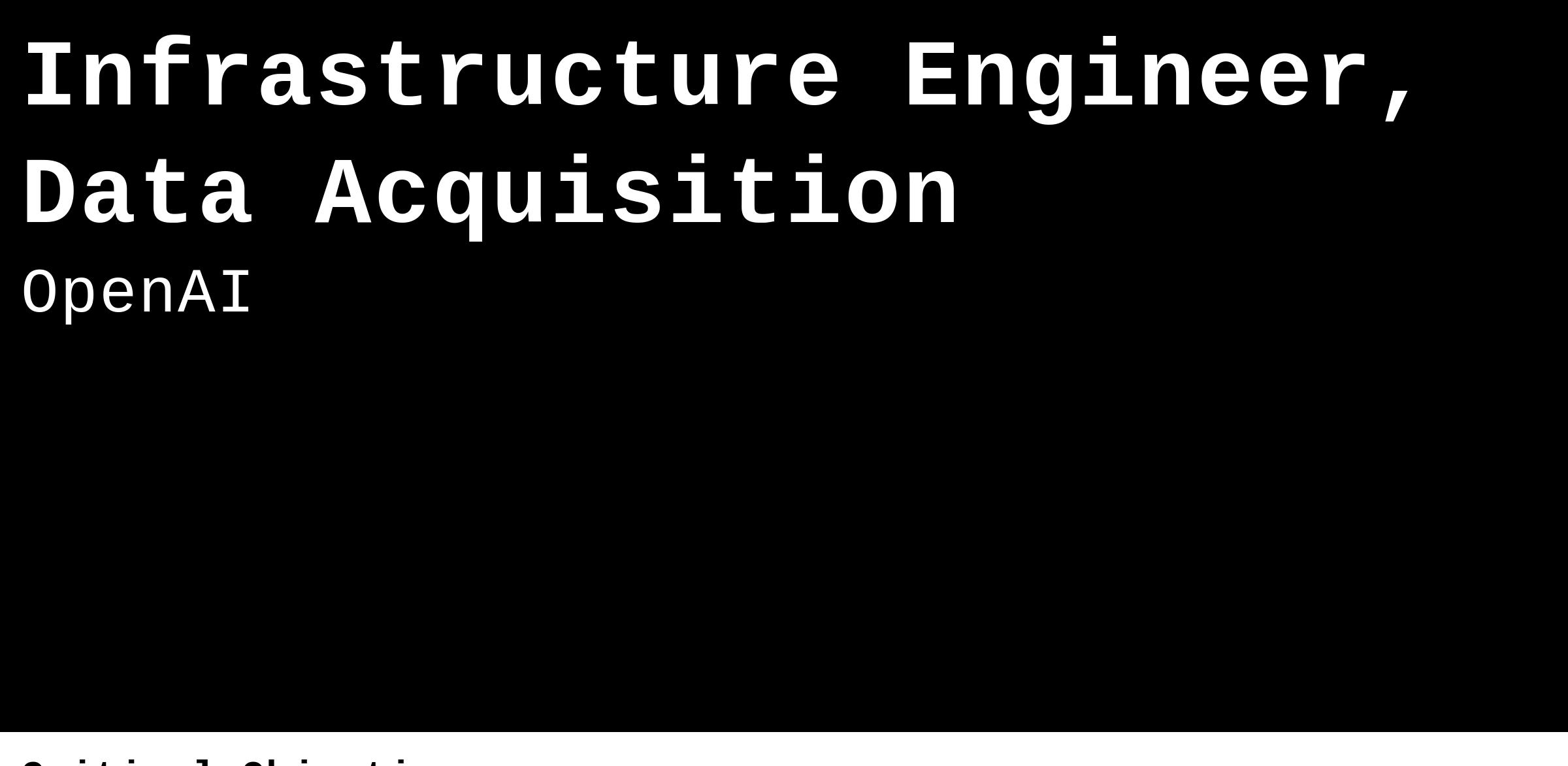 The Data Acquisition (DAQ) organization is responsible for building and operating the data pipelines, crawling, storage systems, and post-processing platforms that fuel OpenAI’s research and product development. Our Infrastructure team’s mission is to enable DAQ developers to move fast with minimal friction, providing “just enough” reliability, observability, and tooling in a highly dynamic environment. We value broad impact and rapid iteration over polished perfection. As our data needs grow by orders of magnitude, this small but scrappy team ensures that our foundational services can keep pace.