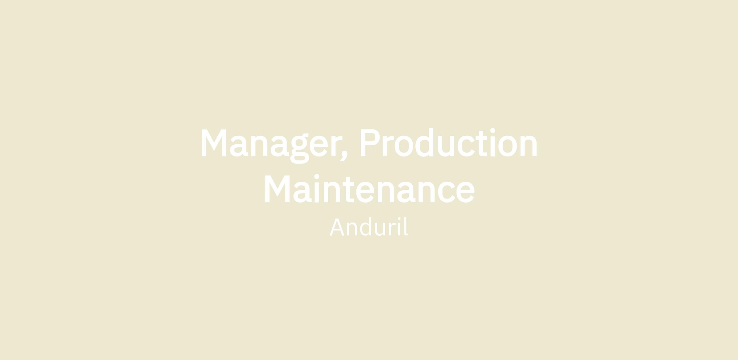 Anduril’s Manufacturing Operations Team is seeking a Production Maintenance Manager to join our team. The Production Maintenance team is responsible for helping scale production at Anduril and ensuring maximum equipment uptime, a world class preventative maintenance program, and supporting line commissioning of our growing production landscape.