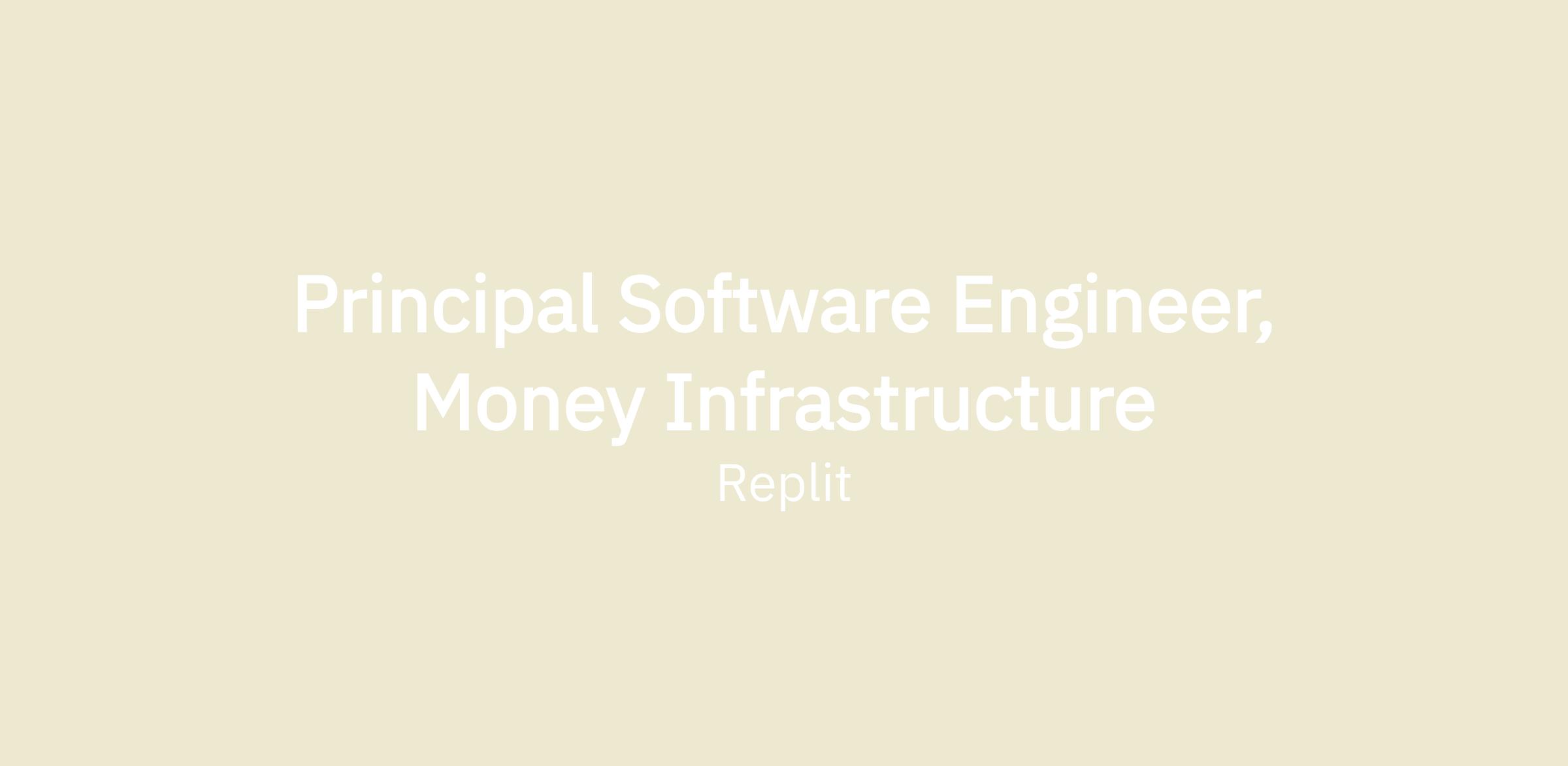 This is a Principal Product Engineering role focused on Money Infrastructure at Replit. Youโll work on the financial backbone that powers how Replit earns money, how builders earn money, and how Agents transact.