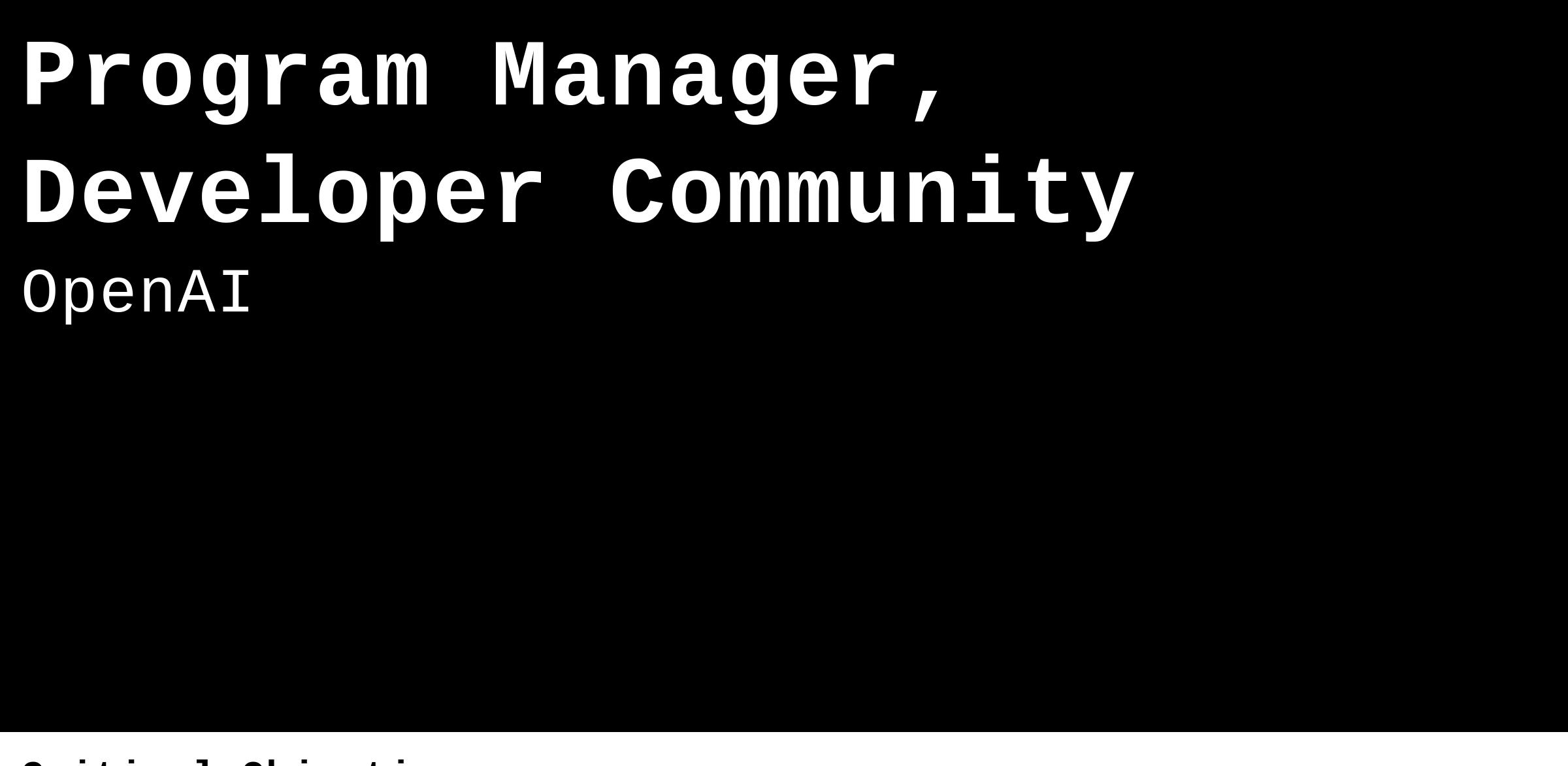 We’re looking for somebody to execute and scale high-impact programs for our Developer Community function. As Program Manager, you’ll foster a community of new and existing developers that rely on OpenAI’s technologies. You will help organize meetups worldwide, stoke online engagement around our developer products, and act as an owner of the developer voice within OpenAI. Your work will bridge the gap between our developer community and internal teams, ensuring developers' needs are met and their voices heard.