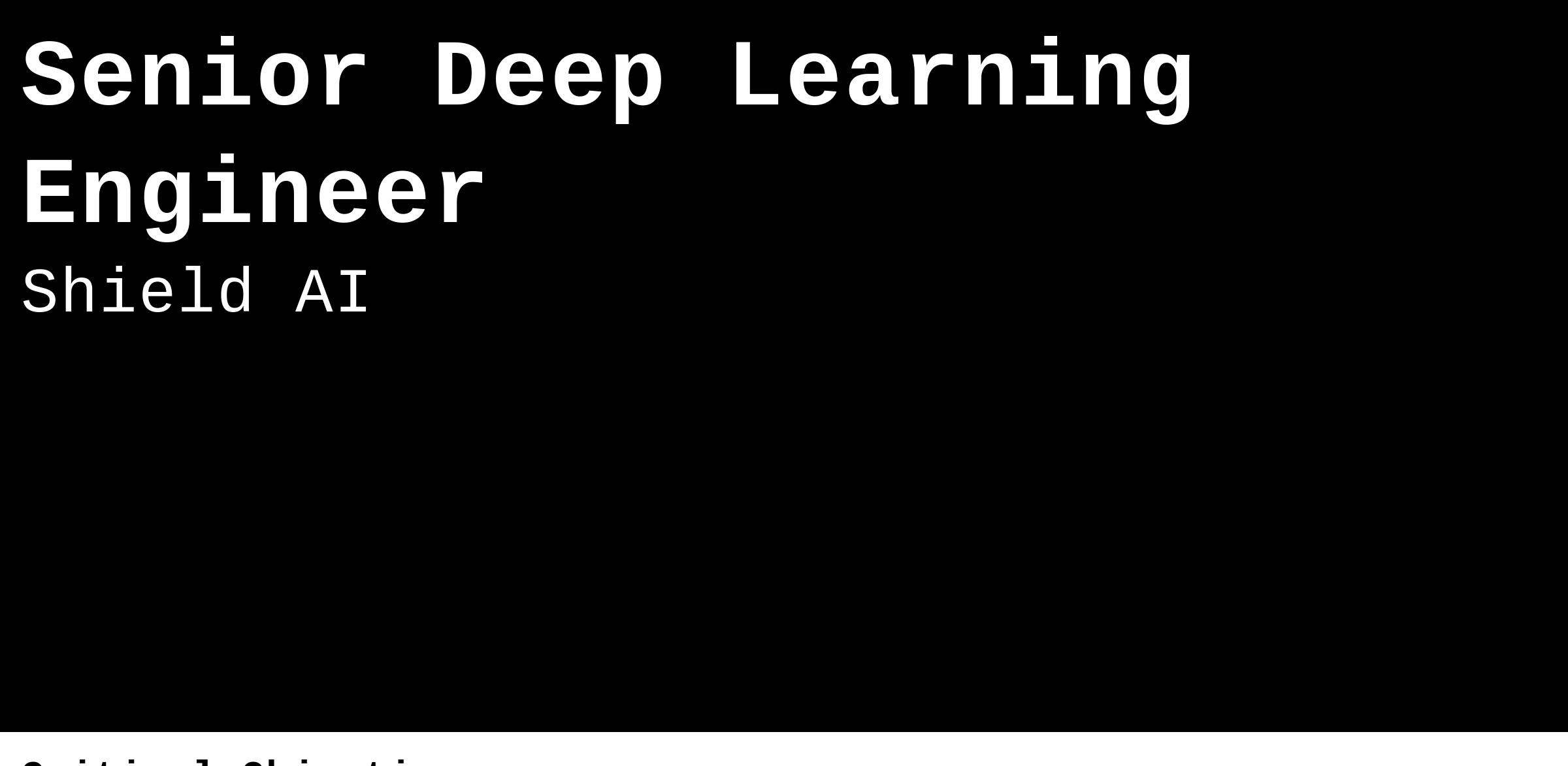Shield AI is proud to be an equal opportunity workplace and is an affirmative action employer. We are committed to equal employment opportunity regardless of race, colour, ancestry, religion, sex, national origin, sexual orientation, age, marital status, disability, gender identity or Veteran status. If you have a disability or special need that requires accommodation, please let us know.