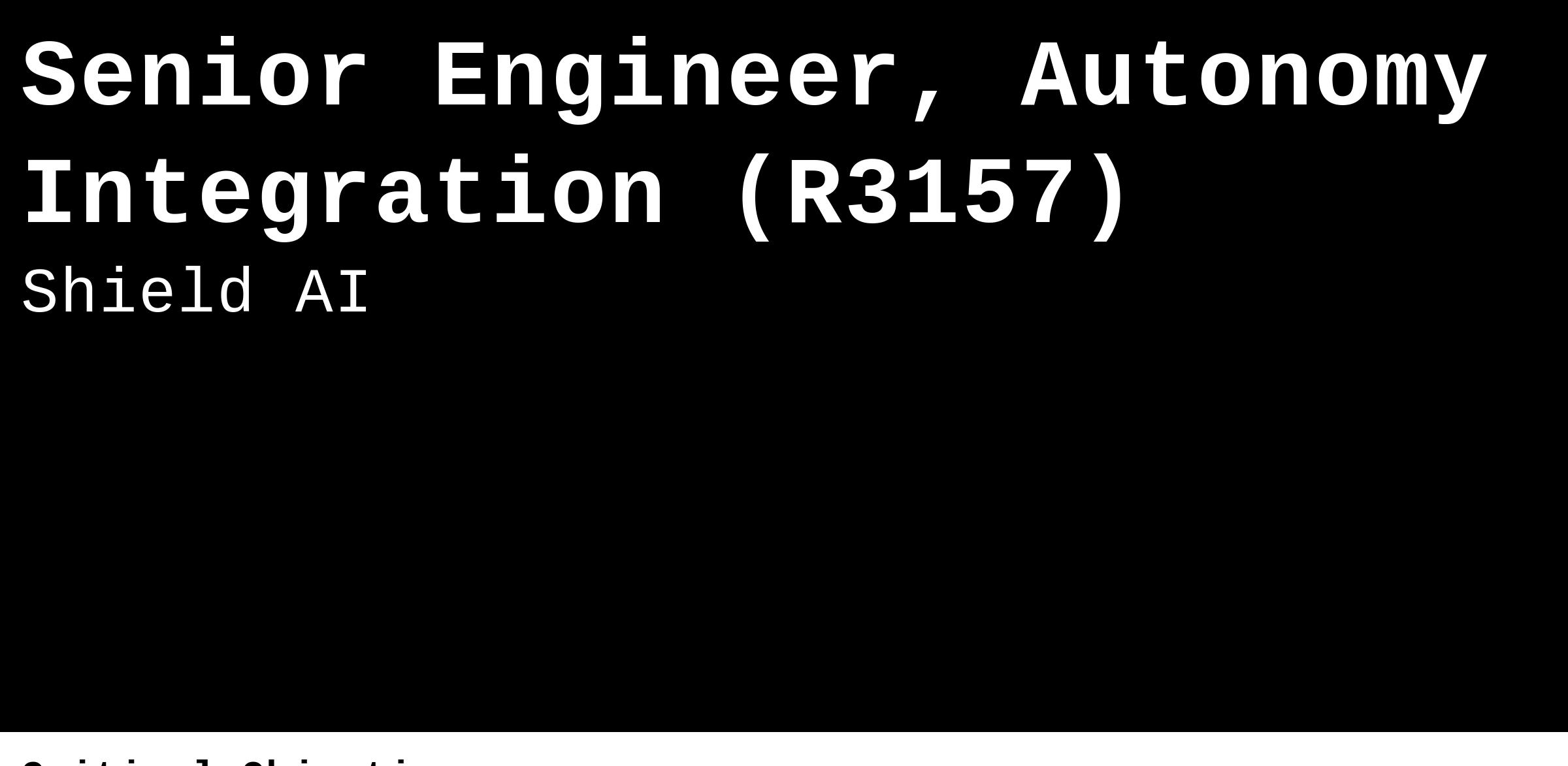 Shield AI is proud to be an equal opportunity workplace and is an affirmative action employer. We are committed to equal employment opportunity regardless of race, color, ancestry, religion, sex, national origin, sexual orientation, age, marital status, disability, gender identity or Veteran status. If you have a disability or special need that requires accommodation, please let us know.