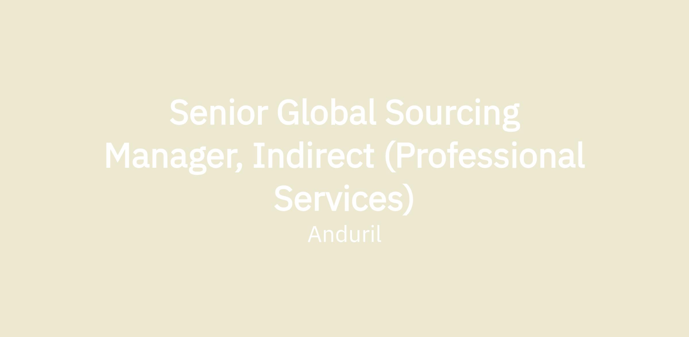 The Senior Global Sourcing Manager, Indirect Professional Services is the domain expert in dedicated Professional Services commodities for Anduril Industries. This role will be responsible for developing new supplier and new sourcing partnerships that can be incorporated into new services/products, as well as existing services/products to improve their technologies, cost, and quality. This hire will work with the broader internal cross functional teams to evaluate the opportunities, while ensuring commercial agreements, intellectual property, and statement of works are accurate and well established prior to pipelining.