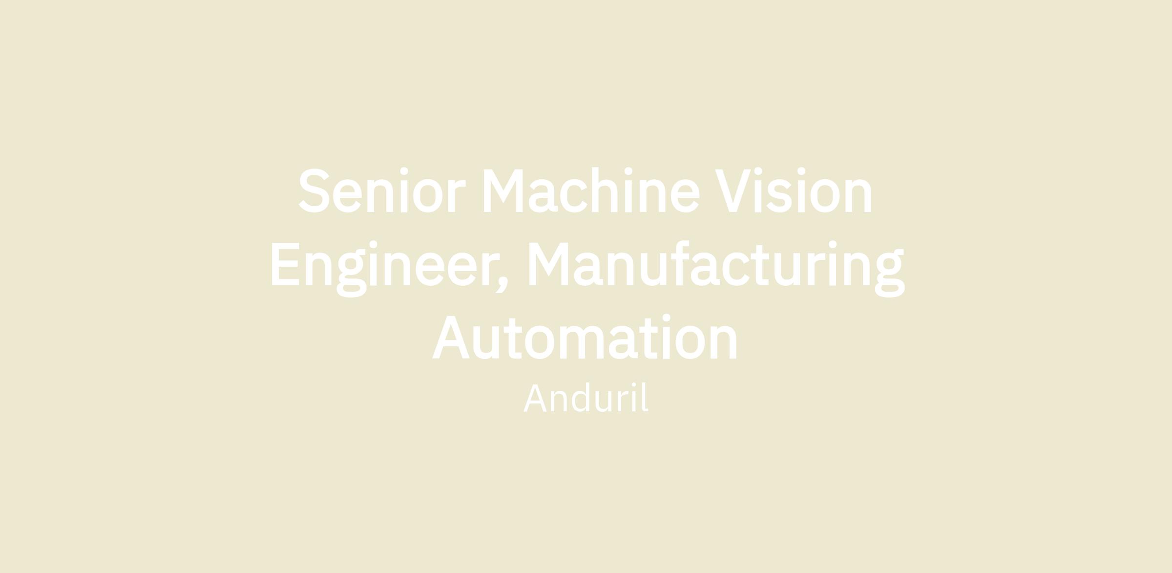 Anduril’s Manufacturing Automation team is seeking a Senior Machine Vision Engineer to join our team. The Manufacturing Automation team is responsible for the design, integration, and deployment of automated manufacturing systems across Anduril factories. As a member of this team, you will have the opportunity to help define what production automation looks like for Anduril at a national scale.