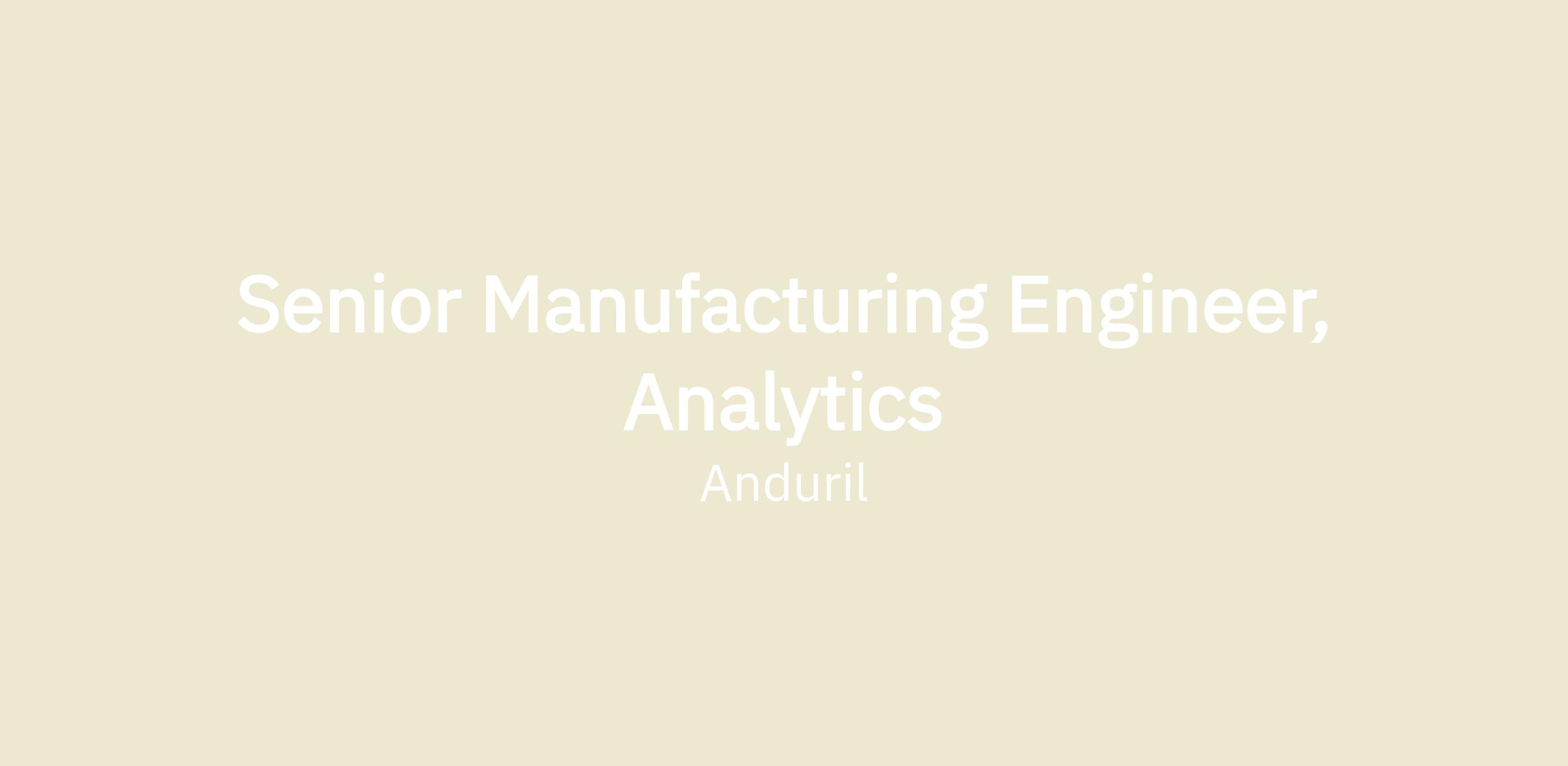 Anduril’s Digital Manufacturing team is seeking a Senior Manufacturing Engineer, Analytics to join our team. The Digital Manufacturing team plays a pivotal role in optimizing manufacturing operations through the implementation and management and advanced digital solutions. The team ensures that manufacturing processes are efficient, scalable, and integrated with the latest industry standards.