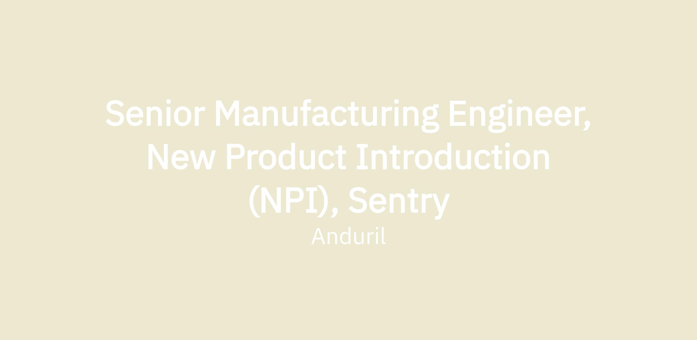 Anduril’s Sentry Manufacturing team is seeking a Senior Manufacturing Engineer with strong NPI experience to join our team. The Manufacturing Team is responsible for rapidly iterating and building cutting-edge defense hardware, including static equipment and moving ground equipment, to provide force protection and counter-UAS support. This responsibility includes everything in the manufacturing value-chain, including, but not limited to, Design for Manufacturability work, tool design & selection, process creation & optimization, vendor sourcing & interaction, quality planning, and work documentation associated with the hardware that the Manufacturing Engineer owns.