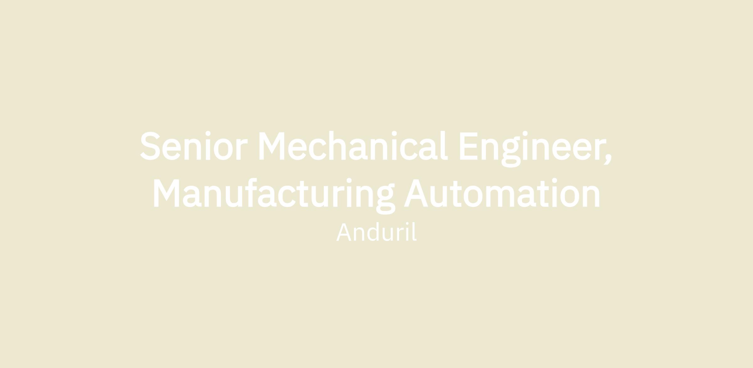 Anduril’s Manufacturing Automation team is seeking a Senior Mechanical Engineer to join our team. The Manufacturing Automation team is responsible for the design, integration, and deployment of automated manufacturing systems across Anduril factories. As a member of this team, you will have the opportunity to help define what production automation looks like for Anduril at a national scale.