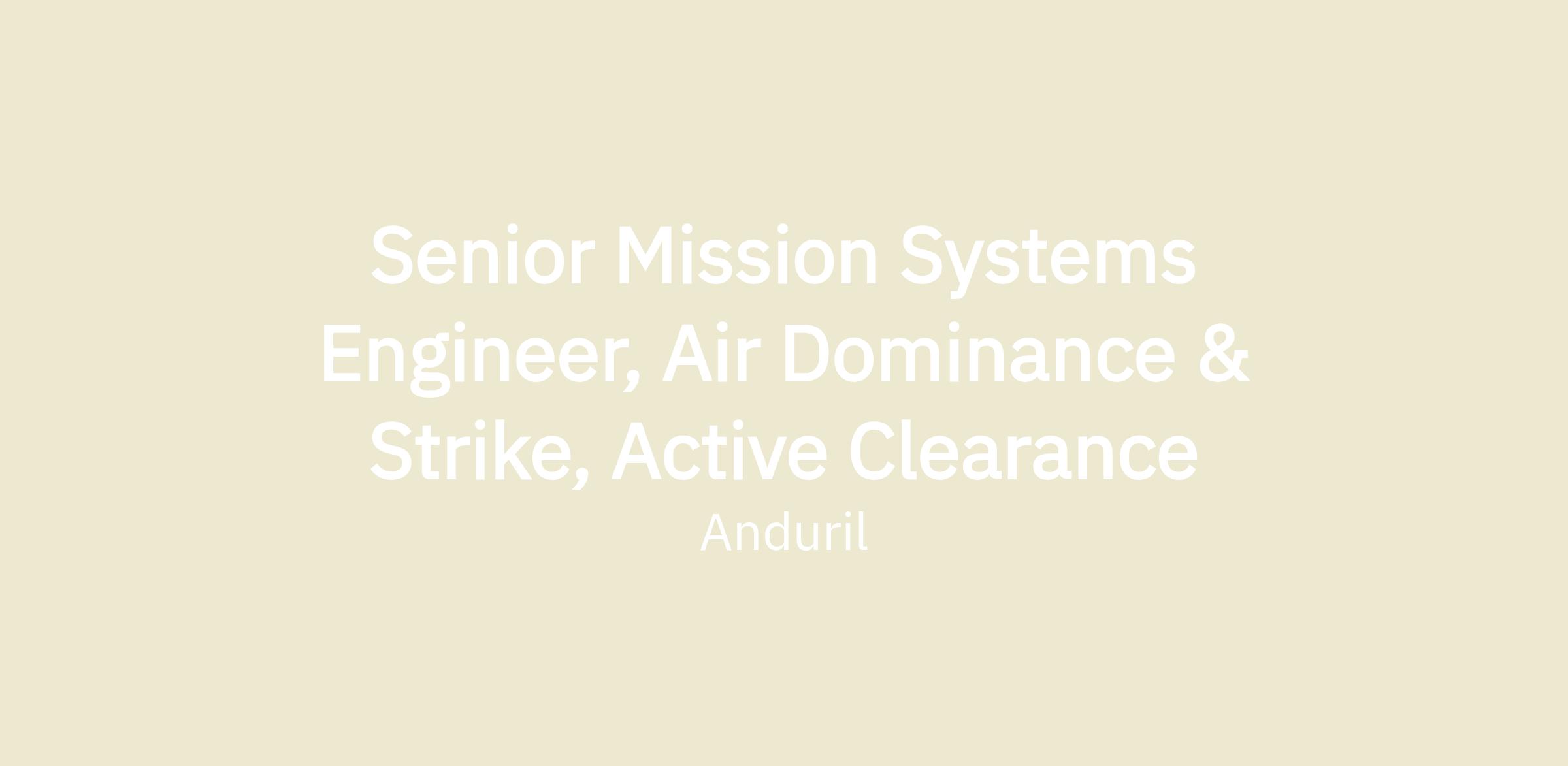 Anduril’s Air Dominance and Strike (AD&S) team is seeking a Mission Systems Engineer to join our team. The AD&S team is responsible for developing end-to-end “mission-ized” autonomous air systems capable of delivering exceptional warfighter outcomes to our customers.