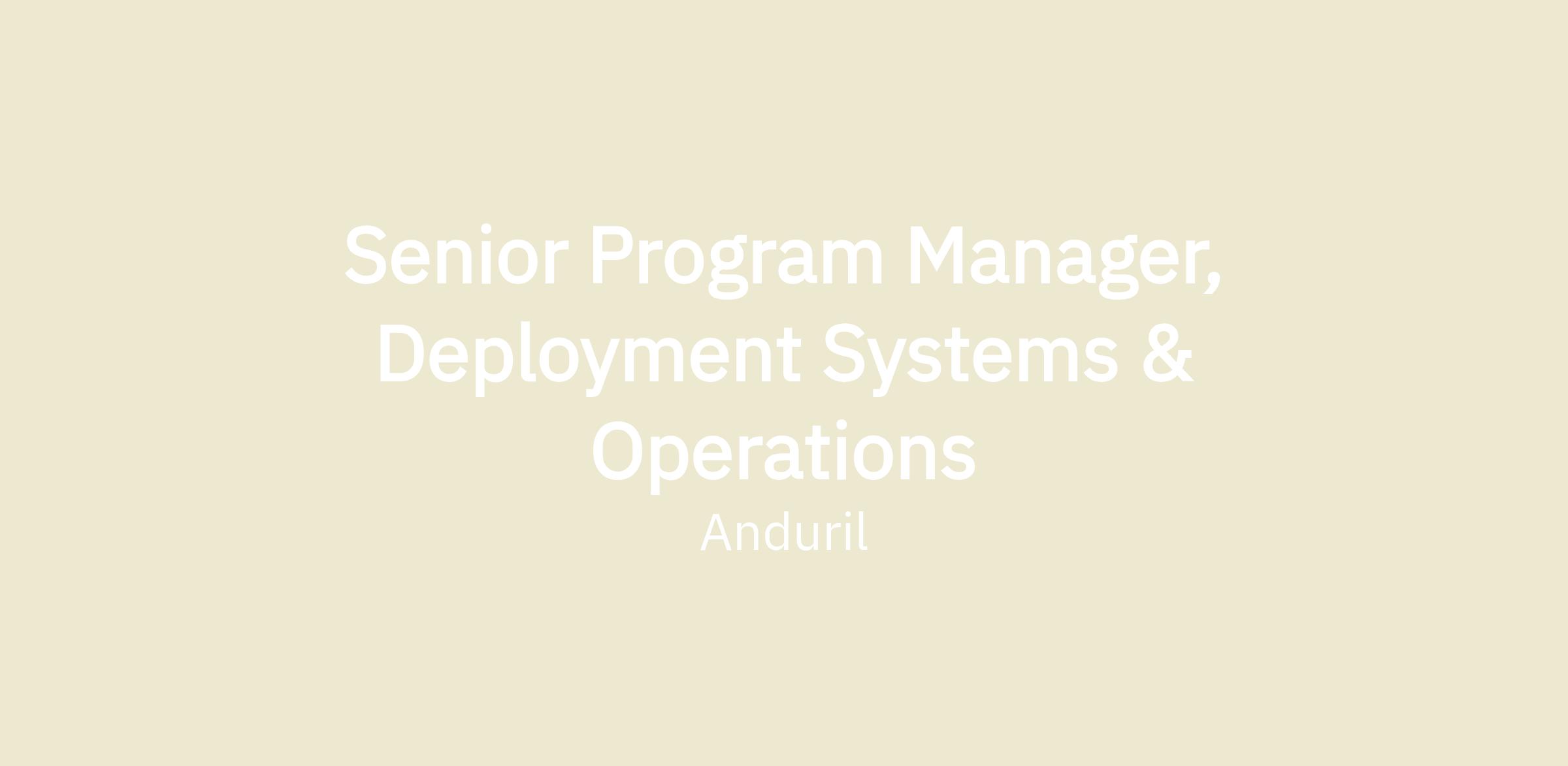We are seeking a Senior Program Manager, Deployment Systems & Operations to define, architect, and scale the digital infrastructure and operational processes that power Anduril's global deployment capabilities. You will own end-to-end the systems, workflows, and frameworks that enable mission-critical defense solutions to reach the field with speed, reliability, and operational excellence.