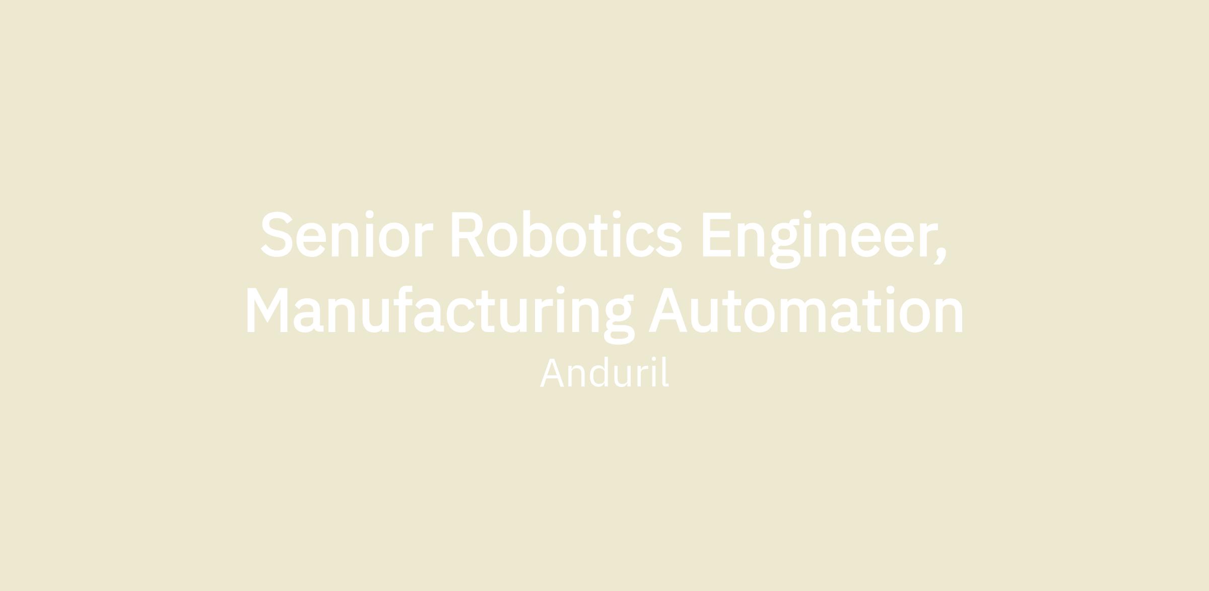 Anduril’s Manufacturing Automation team is seeking a Senior Robotics Engineer to join our team. The Manufacturing Automation team is responsible for the design, integration, and deployment of automated manufacturing systems across Anduril factories. As a member of this team, you will have the opportunity to help define what production automation looks like for Anduril at a national scale.