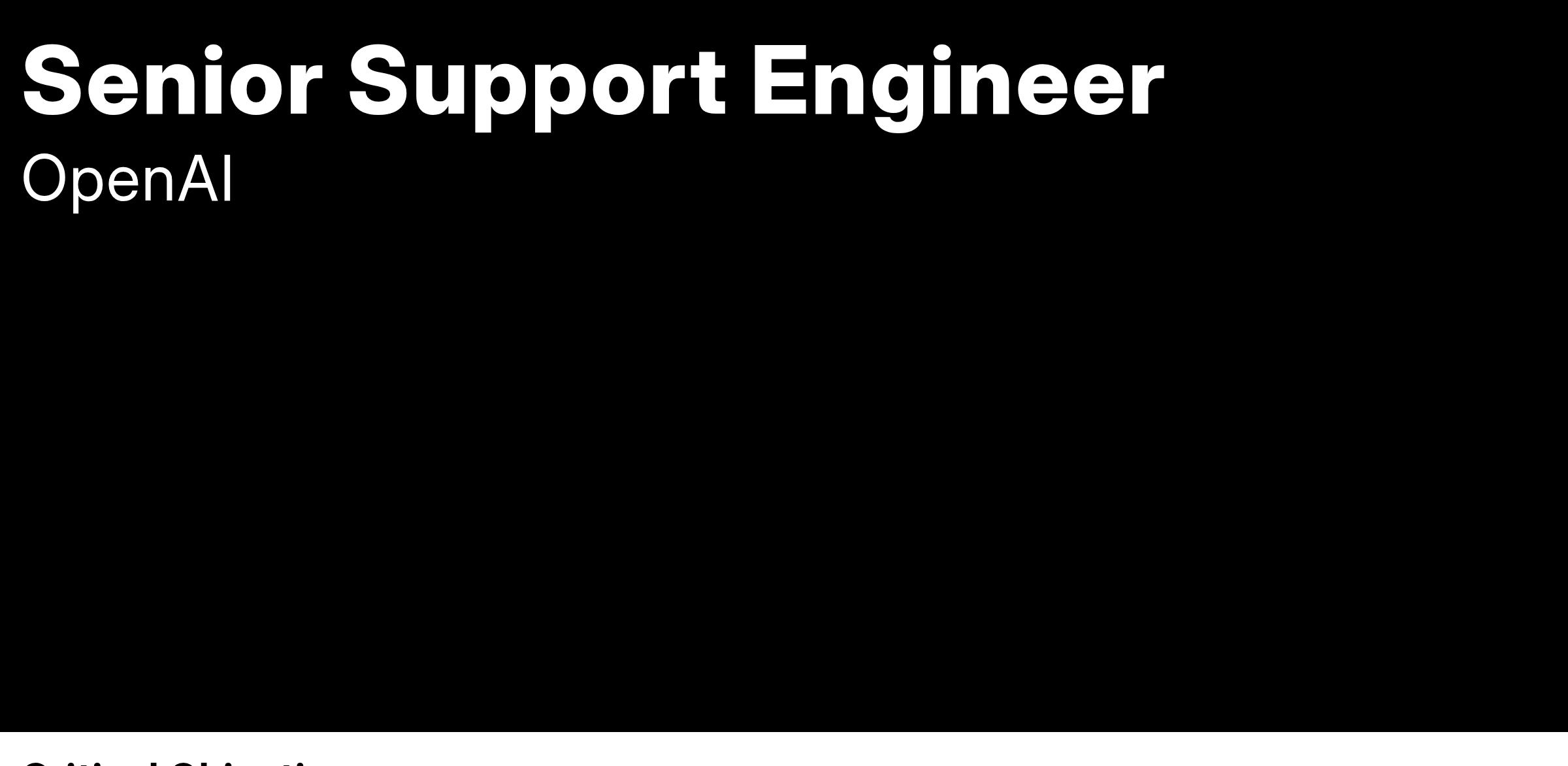 We are looking for a senior support engineer to collaborate directly with our strategic enterprise accounts, helping solve some of the most difficult problems faced by our Customers. You will be part of the best technical troubleshooting team at OpenAI, and our Customers and Engineering teams will look to you for technical guidance in addressing the most technically difficult issues in our environment. You will play an integral role in building knowledge within the team and be part of strategic initiatives for organizational and process improvements. Working directly with our most strategic Customers - You will be crucial to the success of the most innovative, disruptive, and high-scale AI solutions being built with the OpenAI API platform.