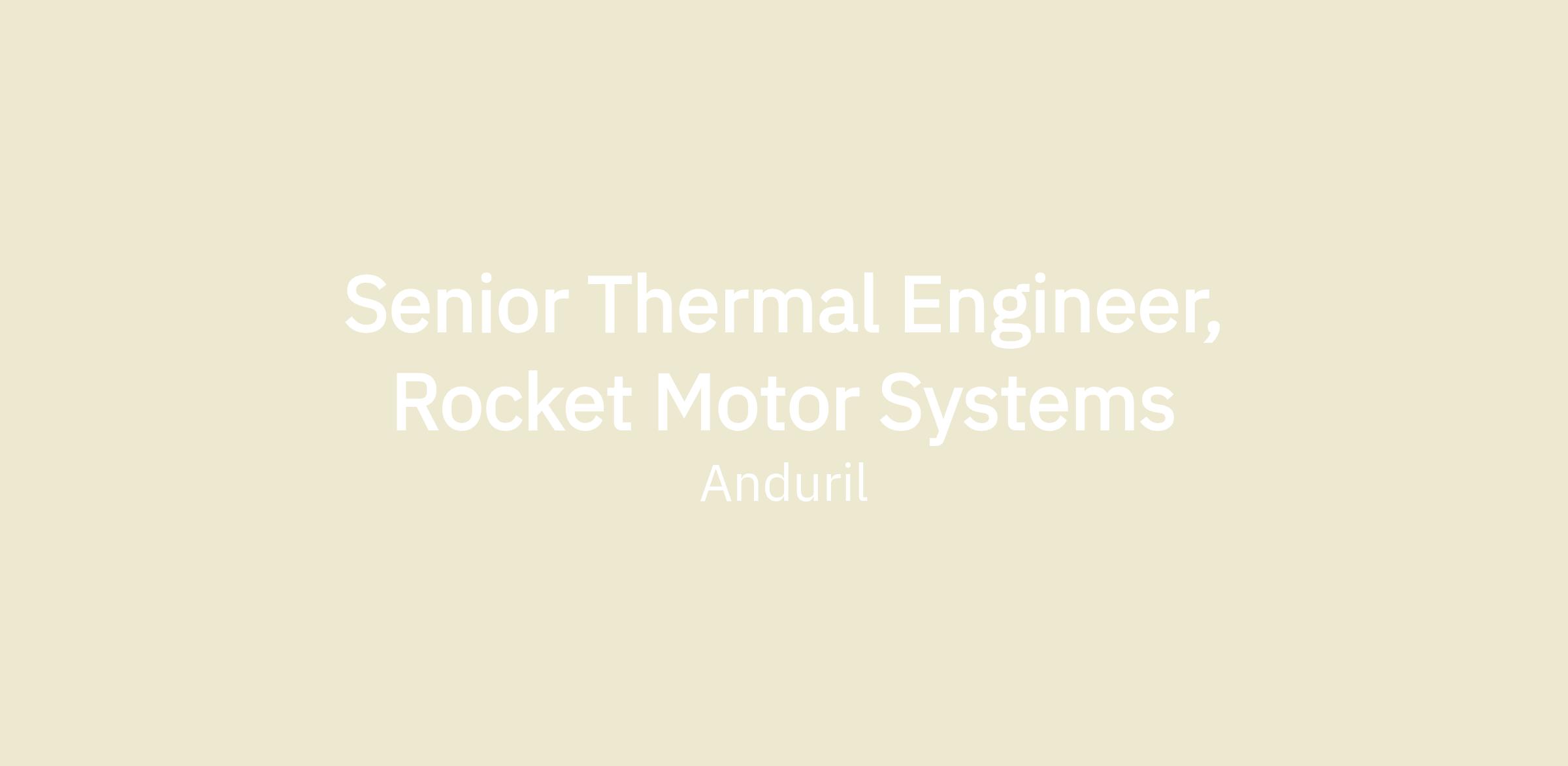 Anduril’s Rocket Motor Systems group is seeking a Senior Thermal Engineer to join our team. The Rocket Motor Systems group designs, develops, and manufactures next-generation solid rocket motors for defense and space applications at Anduril. As a Thermal Engineer you will conduct detailed thermal analysis of solid rocket motor components. The right person for this role has a strong understanding of thermal analysis principles, with expertise in some of the tools common in industry.