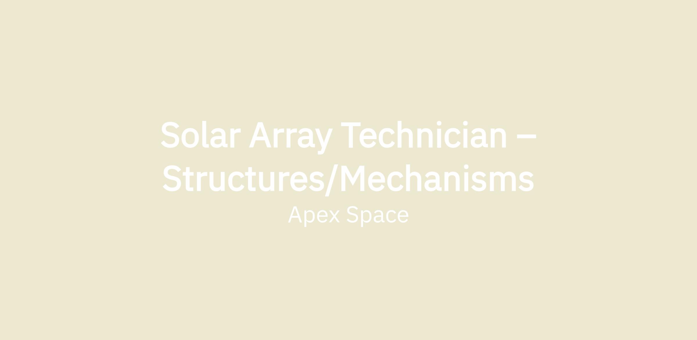 Apex Space is seeking a Structures & Mechanisms Technician to support the assembly and integration of solar array mechanical systems within our satellite bus production line. You will work alongside mechanical engineers to build, align, and verify deployment mechanisms, pantograph assemblies, hinges, and structural subassemblies to tight engineering tolerances.