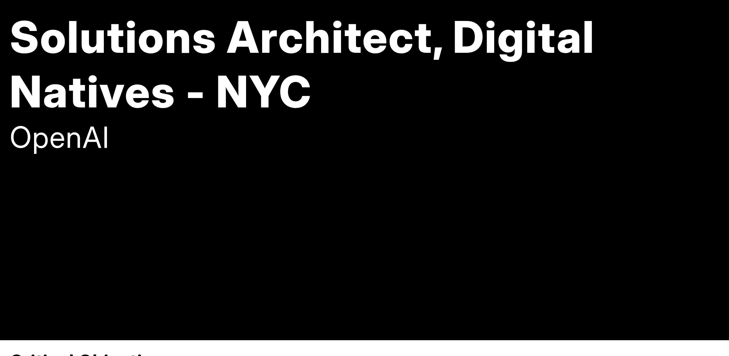 We are looking for a driven solutions leader with a product mindset to partner with our customers and ensure they achieve tangible business value with GenAI. You will pair with senior customer leaders to establish a GenAI strategy and identify the highest value applications. You’ll then partner with their engineering and product teams to move from prototype through production. You’ll take a holistic view of their needs and design an enterprise architecture using OpenAI API and other services to maximize customer value. You will collaborate closely with Sales, Solutions Engineering, Applied Research, and Product.