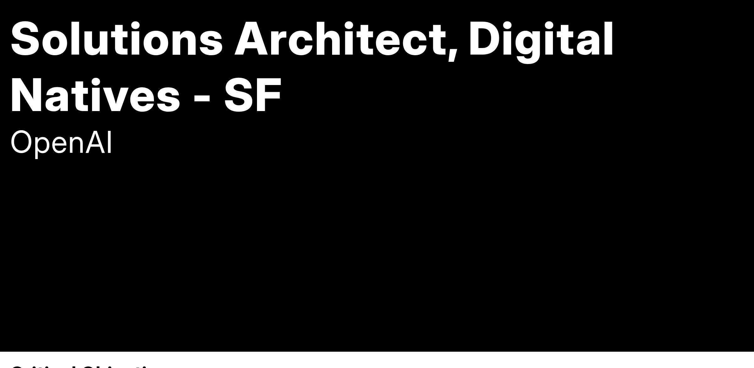 We are looking for a driven solutions leader with a product mindset to partner with our customers and ensure they achieve tangible business value with GenAI. You will pair with senior customer leaders to establish a GenAI strategy and identify the highest value applications. You’ll then partner with their engineering and product teams to move from prototype through production. You’ll take a holistic view of their needs and design an enterprise architecture using OpenAI API and other services to maximize customer value. You will collaborate closely with Sales, Solutions Engineering, Applied Research, and Product.