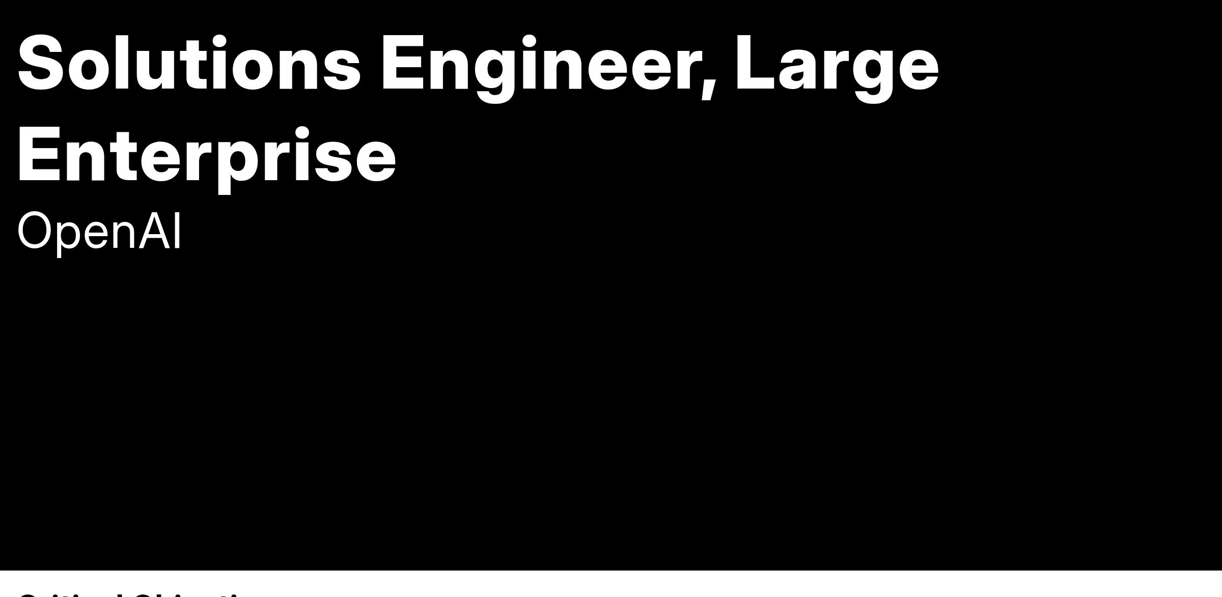 The Technical Success team is responsible for ensuring the safe and effective deployment of ChatGPT and OpenAI API applications for developers and enterprises. We act as a trusted advisor and thought leader for our customers, ensuring developers and enterprises maximize value from our models and products. As a Solutions Engineer in the Large Enterprise segment, you’ll help the largest companies transform their business through solutions such as customer service, automated content generation, and novel applications that make use of our newest, most exciting models.