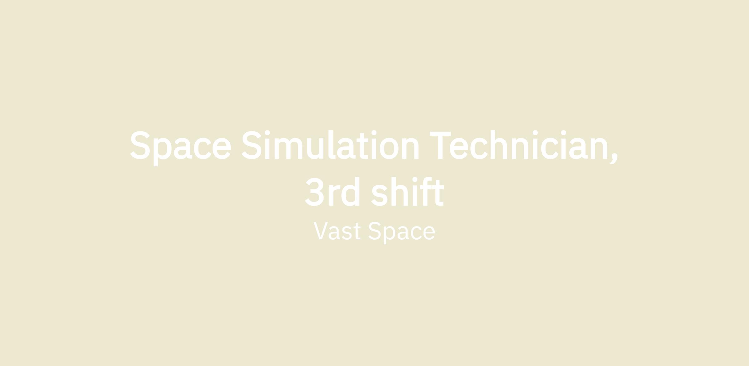 Vast is looking for a Space Simulation Technician, 3rd shift, reporting to the Supervisor of Environmental Testing to support the development of the systems that will be required for the design and build of artificial-gravity human-rated space stations.