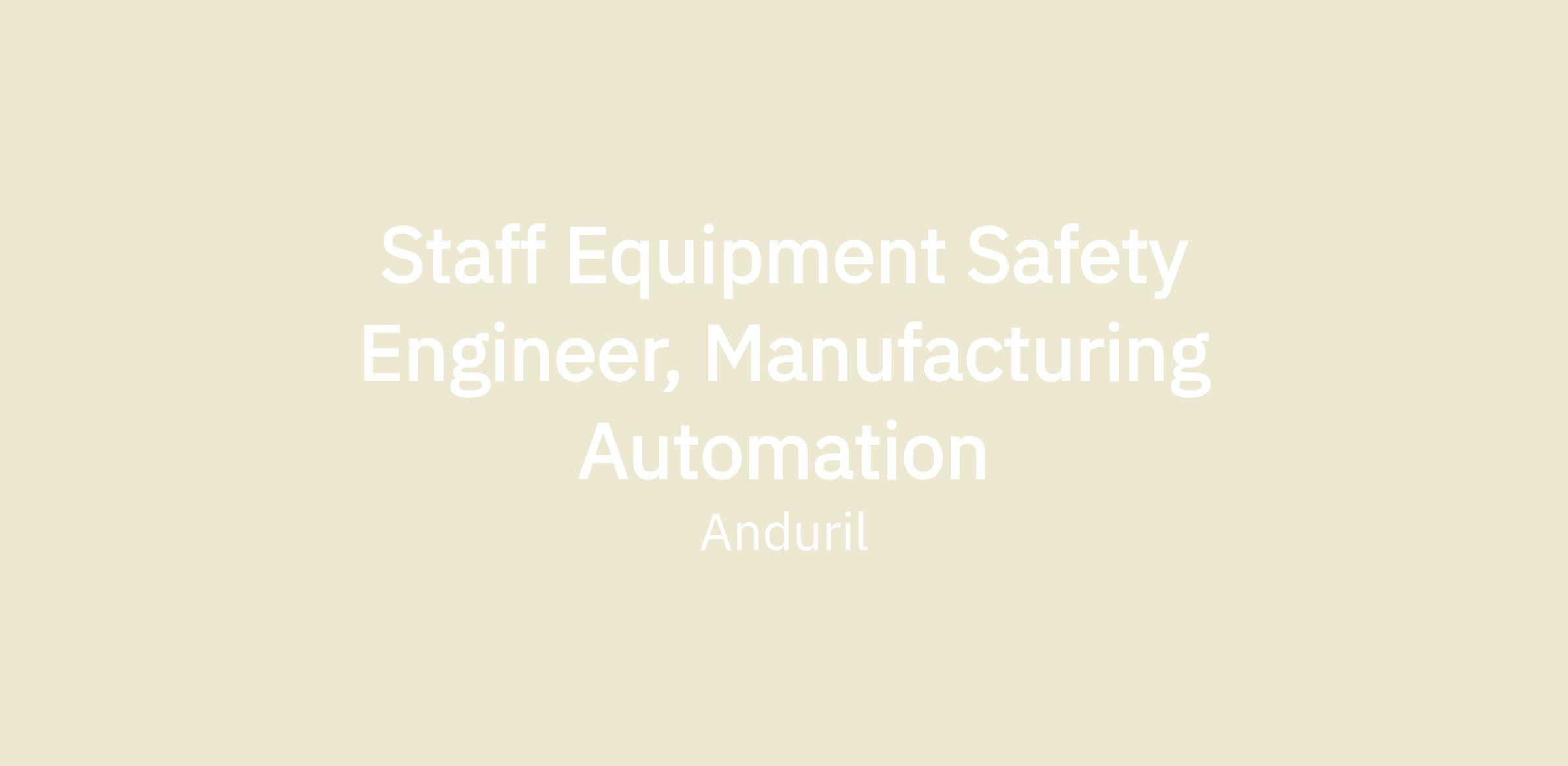 Anduril’s Manufacturing Automation team is seeking a Staff Equipment Safety Engineer to join our team. The Manufacturing Automation team is responsible for the design, integration, and deployment of automated manufacturing systems across Anduril factories. As a member of this team, you will have the opportunity to help define what production automation looks like for Anduril at a national scale.
