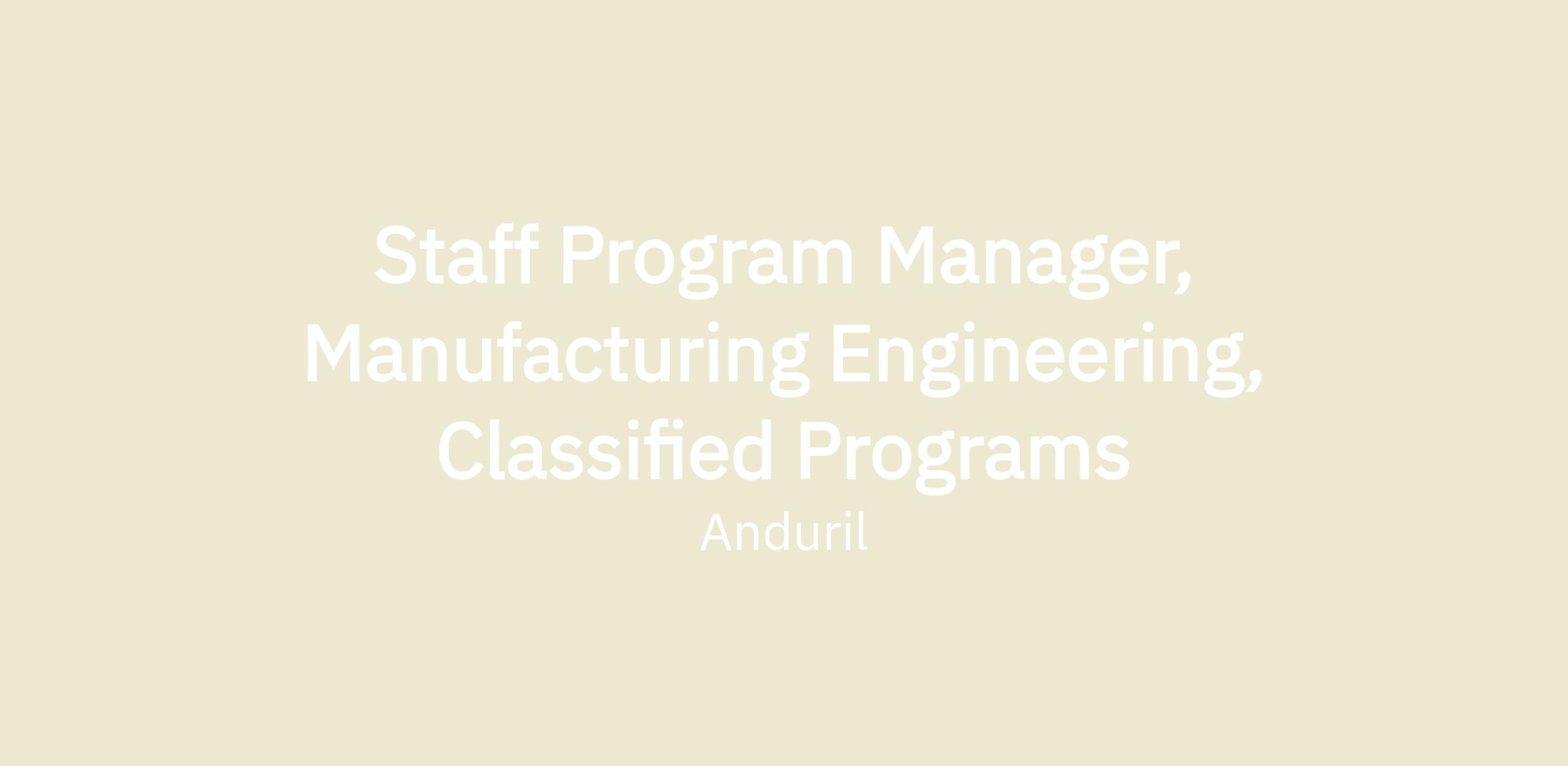 We are seeking an exceptionally qualified and seasoned Staff Program Manager of Manufacturing Engineering to lead and drive manufacturing engineering initiatives within classified programs. This is a pivotal role that requires a proven track record of managing complex manufacturing engineering projects from concept through high-rate production, all while operating within a stringent classified environment. You will be expected to utilize your technical experience in conjunction with your program/project management skills to deliver the best outcome for Anduril and the customer..