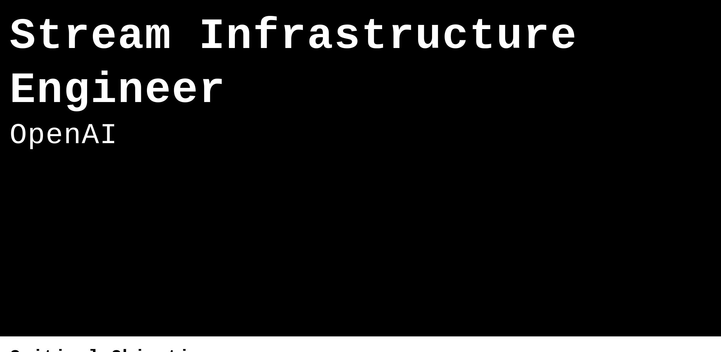 The Streaming Infrastructure team within Data Platform is responsible for building and maintaining our streaming platform. This platform plays a crucial role in facilitating the seamless exchange of data across various systems within OpenAI and serves as a foundational component of our infrastructure.