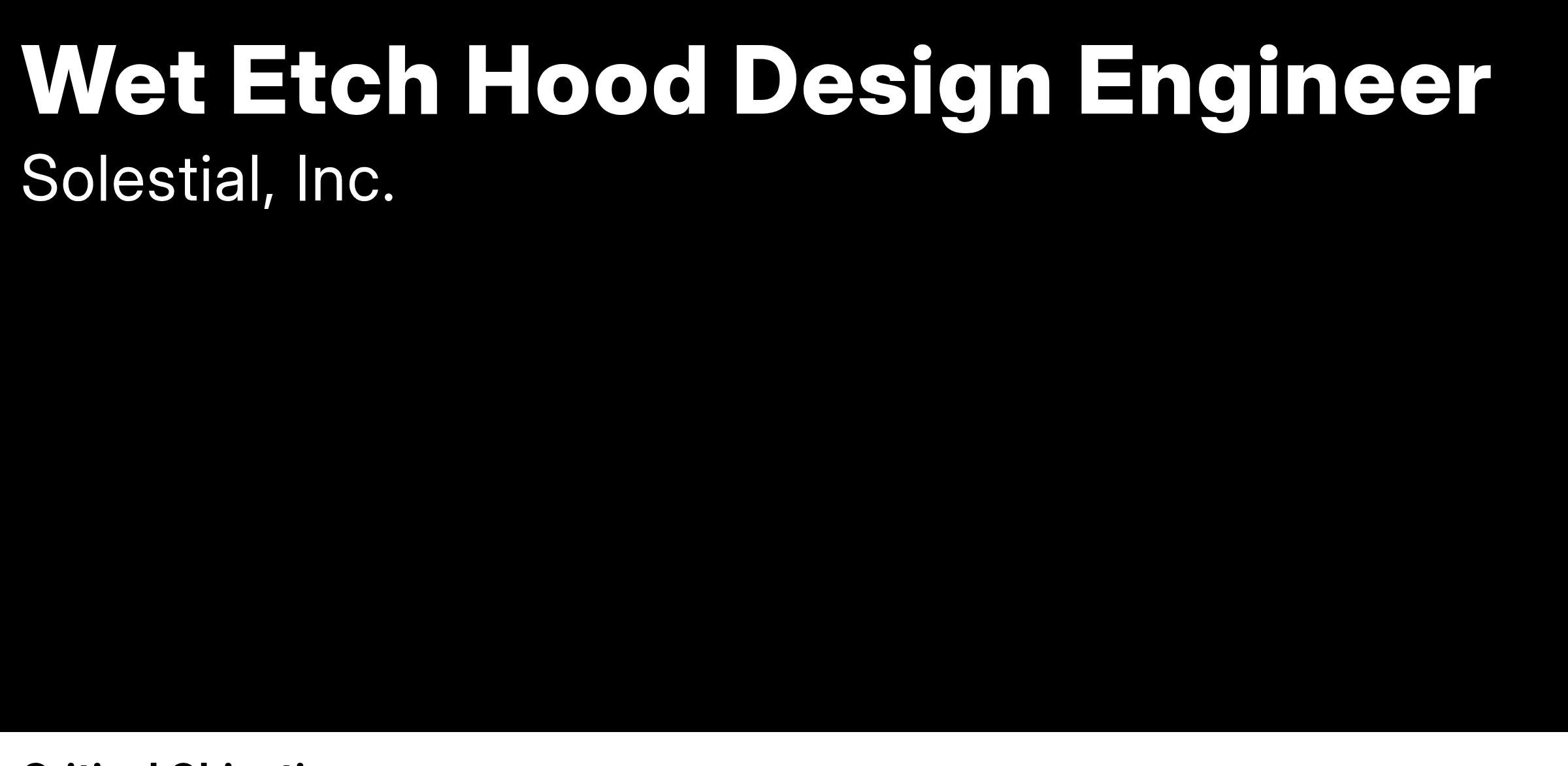 As a Wet Etch Hood Design Engineer you will be working with the chemical, facilities, and 3rd party teams to assist in "cradle to grave" development of prototype wet processing equipment for cell and blanket fabrication lines. You will primarily work on hood layouts for custom processing tanks and equipment, as well as design routing for containment and drain systems into the facility reservoirs. Supply line outputs to the hood such as nitrogen and DI water need also be designed and routed throughout the hood. Secondary responsibilities include participating in design meetings with wet cassette teams for cassette integration into specific wet processing tanks, as well as other minor wet processing equipment. In this role, you will work with 3rd parties to achieve end goals such as tank and containment fabrication, sensor and controller integration, among others. When the hoods are in use, you will meet with chemistry teams and technicians to assess issues and plan future developments. You will also assist the transition of the developed wet processing equipment and tools to a new automated mass production line. This may include using CAD software to develop models of equipment and machine shop drawings, assembly and testing the developed tools. This role will expand from assisting in R&D design and fabrication of wet processing equipment to spearheading development and purchasing of future wet lines for larger production facilities as Solestial grows.