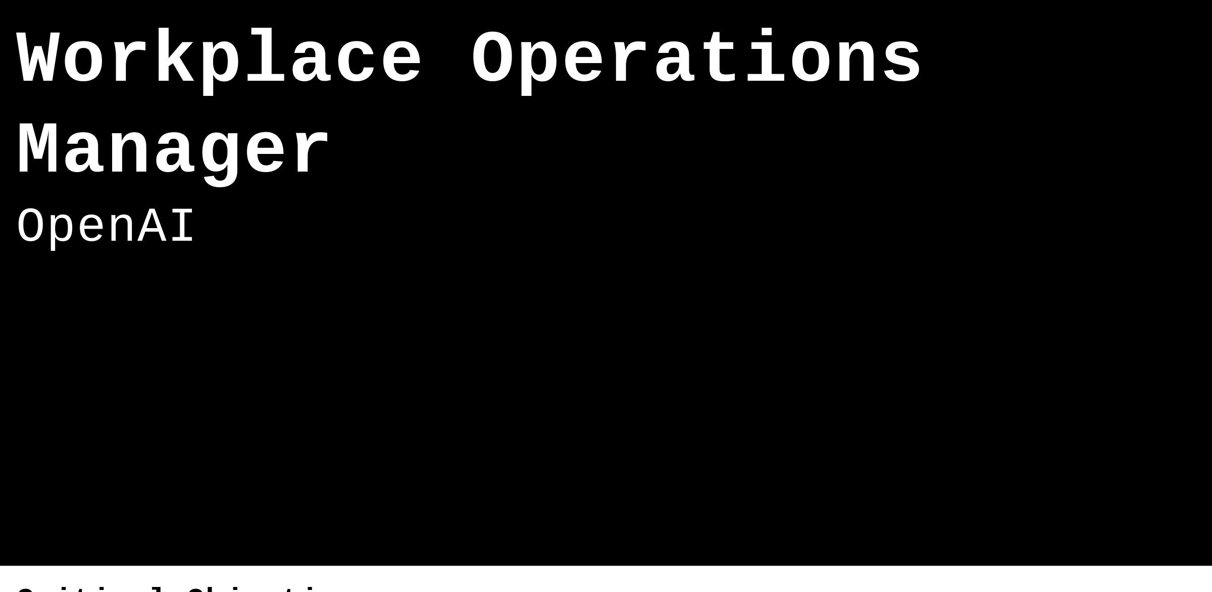 The Real Estate and Workplace Services team at OpenAI is pivotal in crafting and maintaining the physical environments that fuel our innovation and growth. This team ensures our facilities align with our dynamic business objectives. We manage daily operations, optimize workspace designs, and manage leasing and planning for our real estate portfolio. With a strong focus on sustainability and efficiency, the team works closely with internal stakeholders and external partners to create spaces that not only reflect our brand's identity and culture but also enhance employee productivity and well-being. Joining this team means being at the heart of shaping the environments that inspire our technological advancements and support our mission.